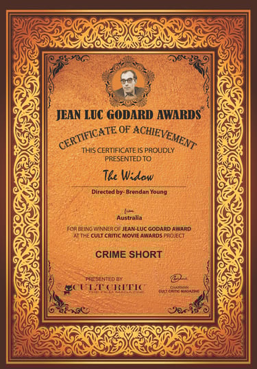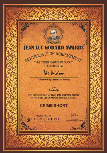 The Widow short film concluded its extensive international festival run, traversing the globe for almost a three year period by picking up it’s 218th award! The proof of concept short film written and directed Brendan Young and produced by Brendan and Catherine McQuade has participated and screened in festivals in countries such as Italy, the United States, China, the U.K., Turkey, Australia, and France to name a few. The latest award “Best Crime Short” comes from the Jean-Luc Godard Awards film festival in Kolkata, India. A spin-off from the Cult Critic Movie Awards. And kind of fitting considering the film’s 1960s black and white , nouvelle vague influenced style. The film is currently screening on a new streaming platform, “Vidiverse” created and curated by celebrated Australian filmmaker Alex Proyas.